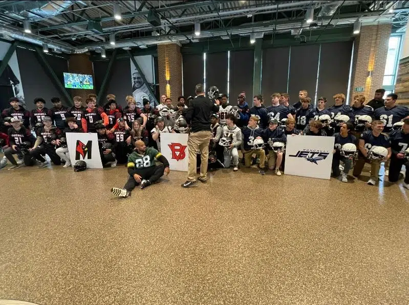 Members of the Marshall, Bay View and Roncalli High School football teams pose for a photo with new helmets provided by the Green Bay Packers organization April 17, 2023, at the Lambeau Field Atrium. Seated at front is Packers running back A.J. Dillon, who surprised the players at the ceremony. PC: Fox 11 Online