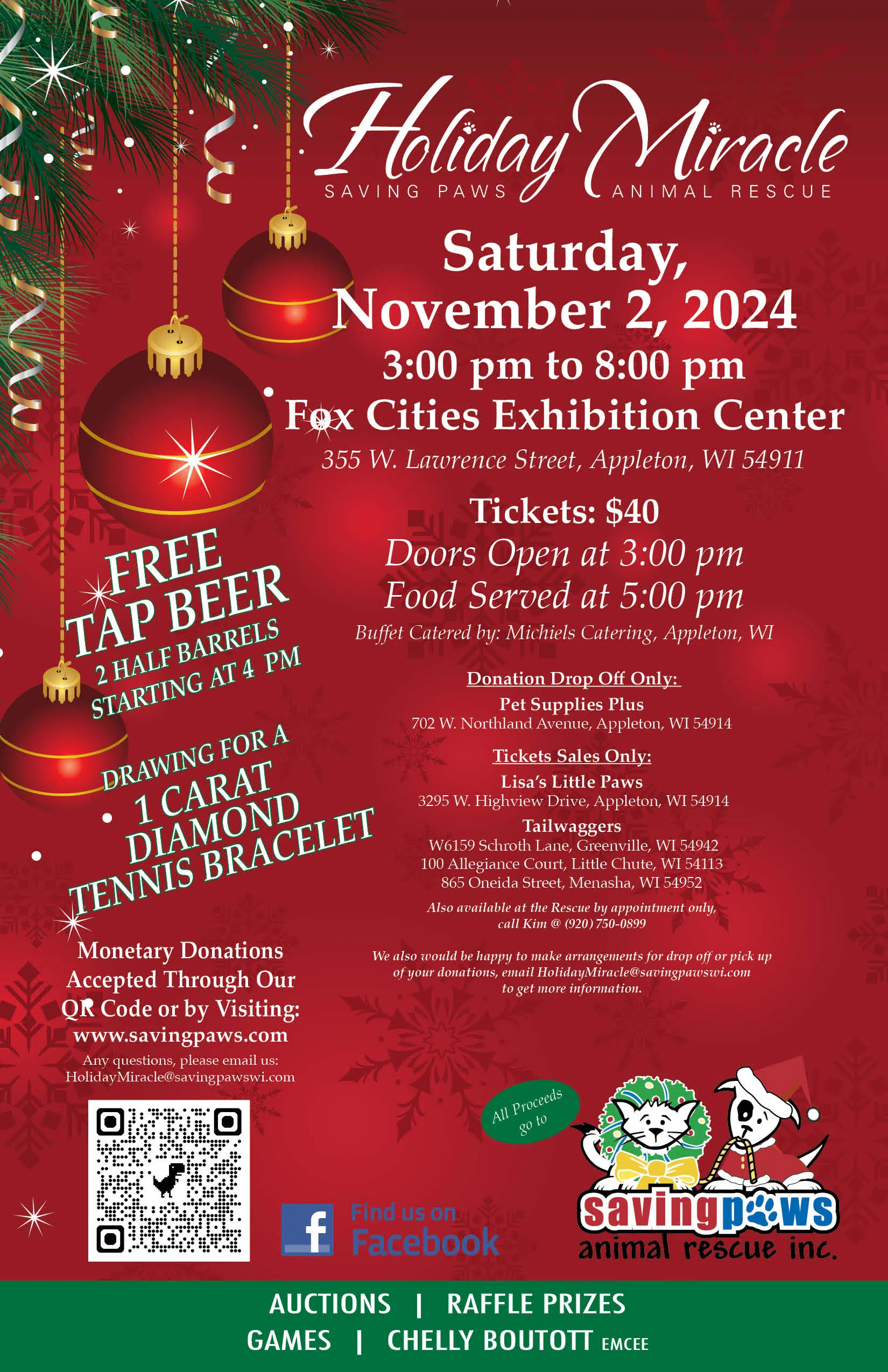 Saving Paws is a no-kill non-profit animal rescue located in Appleton, WI. We are 100% volunteer run and Holiday Miracle is our largest fund raiser of the year!